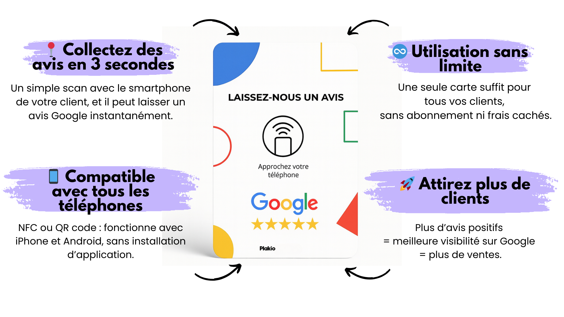 ✔️ Générez plus d’avis clients facilement : Recto NFC ou verso QR code : vos clients choisissent, et accèdent instantanément à votre page Google.